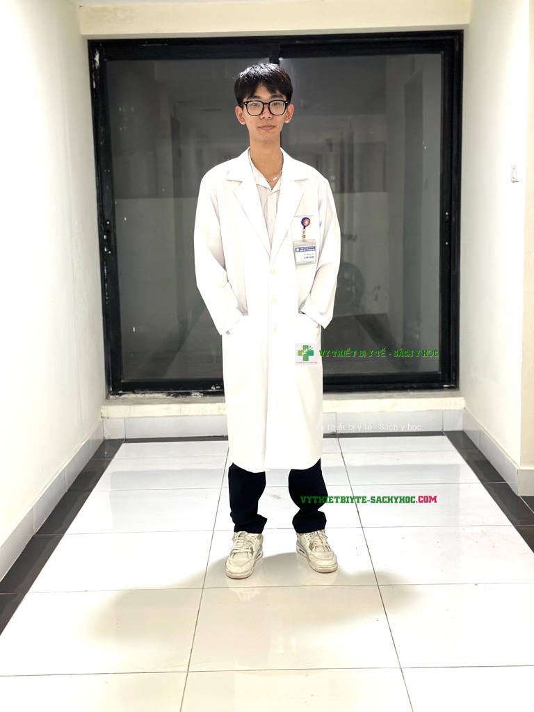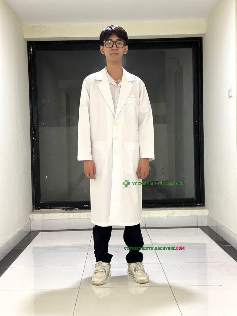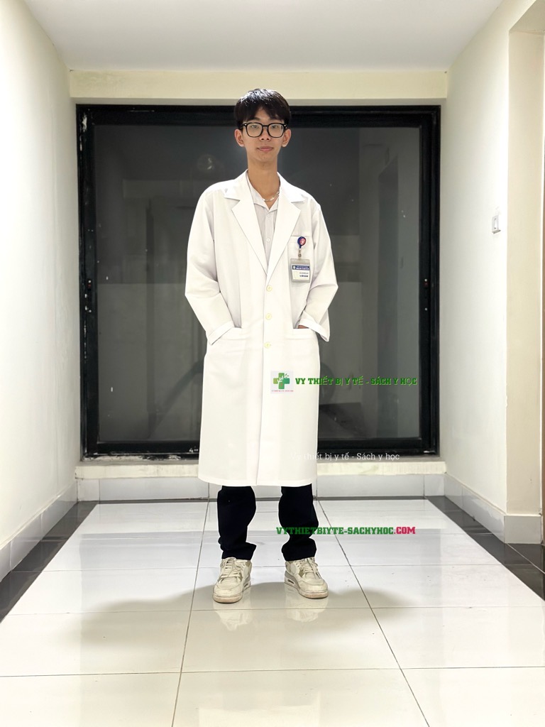 Áo blu trắng cổ vest tay dài có cầu vai xanh là áo đồng phục dành cho sinh viên thực tập, áo trong phòng thí nghiệm. Đây là mẫu áo không thể thiếu trong ngành y. Ngoài ra, còn là áo đồng phục cho bác sĩ bào chế thuốc,…