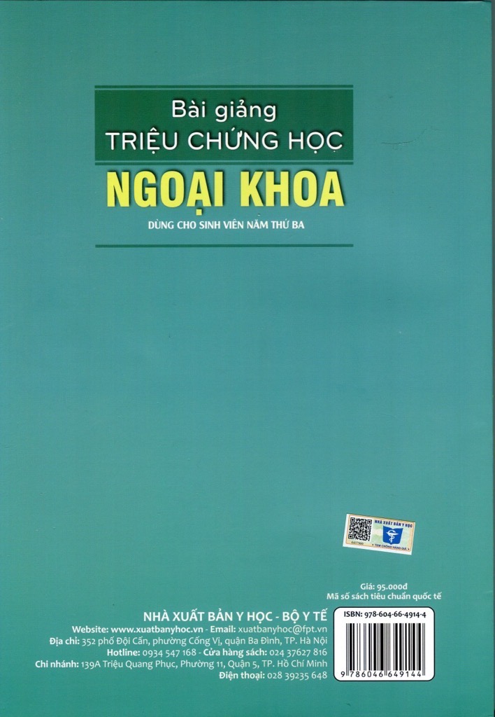 Quyển “Bài giảng triệu chứng học Ngoại khoa” là tập hợp các bài về triệu chứng, hội chứng thường gặp mà sinh viên cần phải học và nắm vững. Các nội dung được trình bày trong cuốn sách là những kiến thức kinh điển và đã được cập nhật. Các tác giả đã cố gắng trình bày một cách chuẩn mực và đầy đủ nhằm trang bị cho sinh viên các kiến thức, kỹ năng và thái độ cần thiết, làm cơ sở vững chắc trong chẩn đoán những bệnh lý Ngoại khoa cũng như các cấp cứu Ngoại khoa thường gặp.