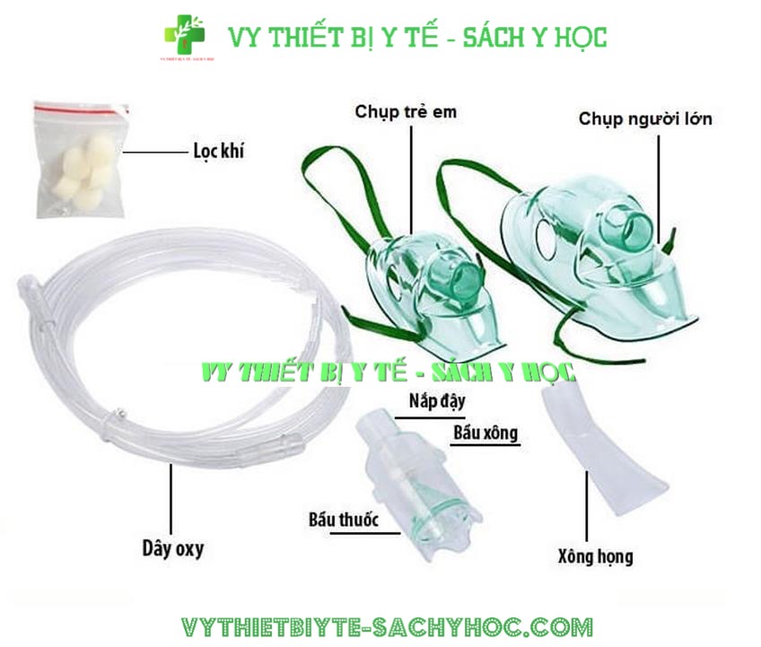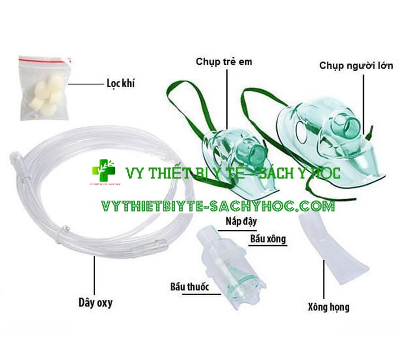 - Bộ gồm : Chụp mặt xông người lớn và trẻ em, cốc điều chỉnh, ngậm xông, cốc xông,Dây xông, xông mũi