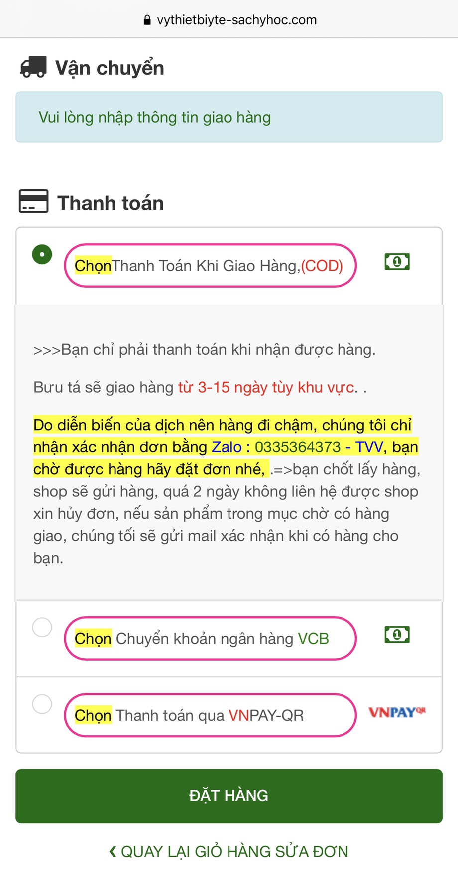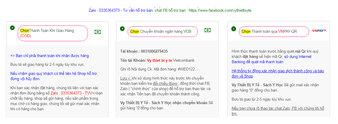 - Đối với sản phẩm trên 3 cân hoặc nhiều tiền trên 3 triệu, đơn hàng buôn sỉ giá tốt, quý khách vui lòng chuyển khoản cọc hoặc chuyển khoản hết đảm bảo quyền lợi buôn sỉ giá tốt của quý khách, Vy thiết bị y tế - sách y học chỉ nhận hỗ trợ thông tin chuyển khoản tư vấn, xác nhận bằng nick Zalo và Facebook chính thức của shop.