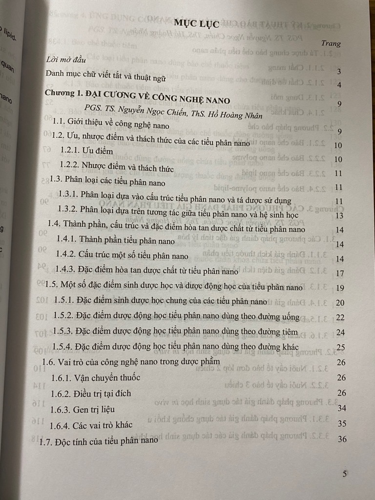 Công nghệ nano ngày càng thu hút được nhiều sự quan tâm của các nhà khoa học và hiện đã được ứng dụng trong nhiều lĩnh vực của đời sống, trong đó có ngành dược phẩm và mỹ phẩm. Với nhiều ưu điểm so với dạng thuốc truyền thống như cải thiện sinh khả dụng, đưa thuốc đến đích, do vậy việc áp dụng công nghệ nano giúp làm tăng hiệu quả điều trị và giảm tác dụng không mong muốn của thuốc, đặc biệt đối với các thuốc điều trị bệnh ung thư. Ngoài những kiến thức cơ bản về công nghệ nano, tài liệu “Công nghệ nano và ứng dụng trong sản xuất thuốc” sẽ giới thiệu thêm cho người học về những thành phần cơ bản của một tiểu phân nano, tóm tắt các phương pháp bào chế các tiểu phân này. Đồng thời, tài liệu này sẽ cập nhật các phương pháp đánh giá đặc tính lý hóa cũng như các phương pháp và mô hình đánh giá tác dụng sinh học in vitro và in vivo của tiểu phân nano. Phần cuối của tài liệu sẽ giới thiệu về các ứng dụng của các tiểu phân nano vào các dạng thuốc hiện đang được nghiên cứu và áp dụng thực tế.