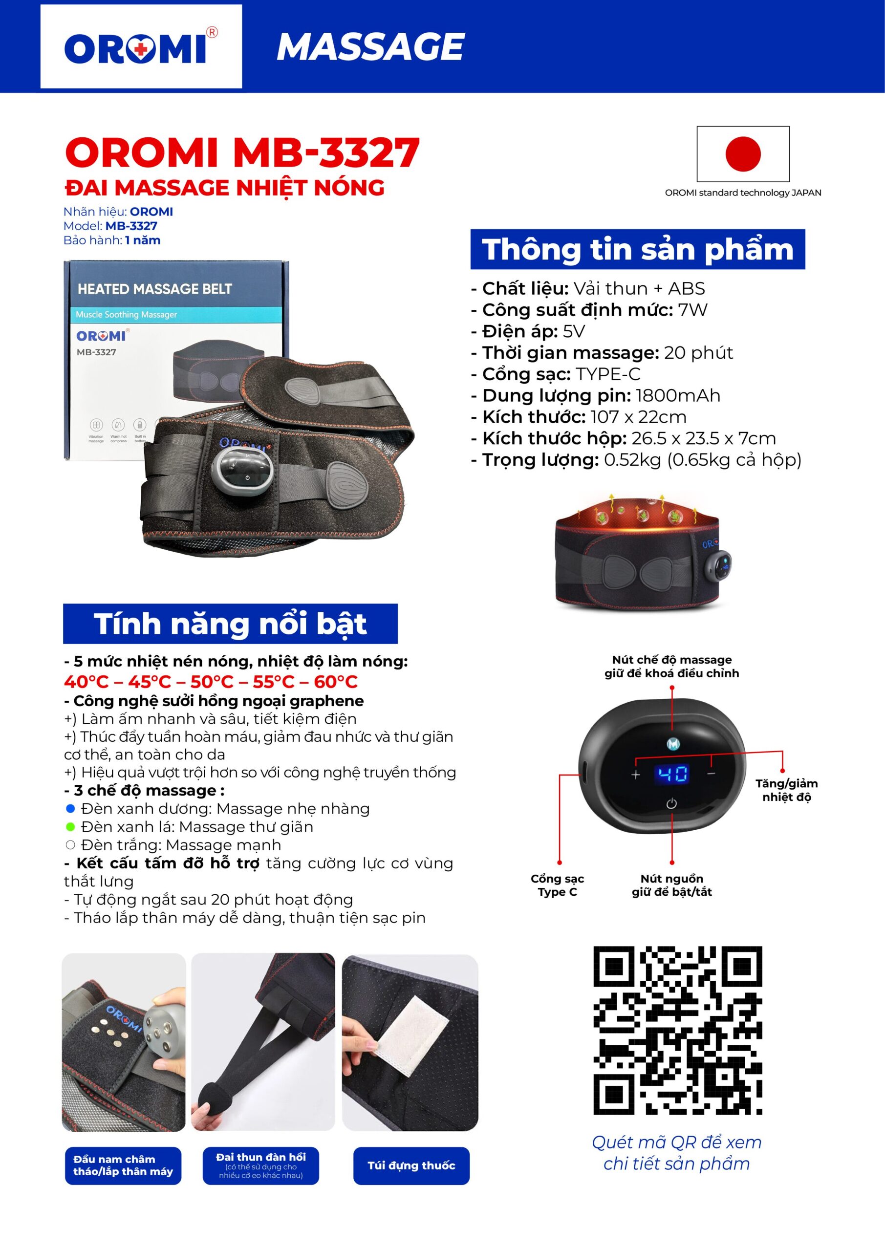 OROMI MB-3327 là đai massage nhiệt nóng giúp thư giãn giảm đau nhức vùng bụng và thắt lưng, hỗ trợ lưu thông máu và điều chỉnh cột sống. Sản phẩm kết hợp công nghệ kéo giãn khí động học, massage...