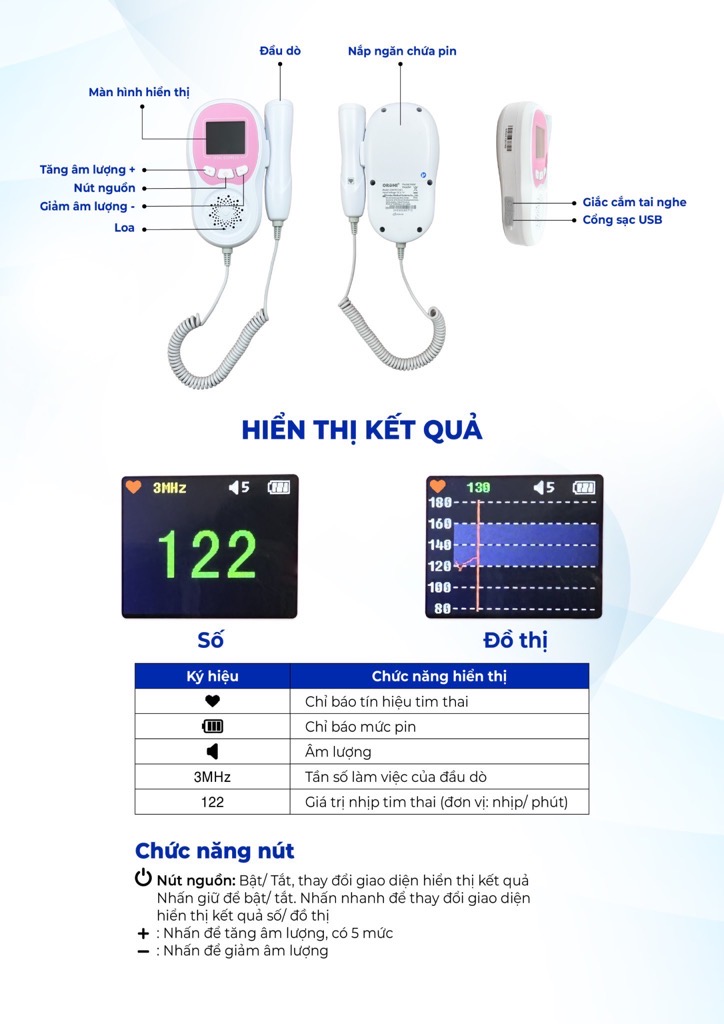 - Đầu dò Doppler có độ nhạy cao, có thể nghe rõ tiếng tim thai khi mang thai hơn 12 tuần