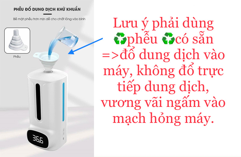 Lưu ý : phải dùng phễu có sẵn đổ dung dịch vào máy, không đổ trực tiếp dung dịch vương vãi ngấm vào mạch hỏng máy