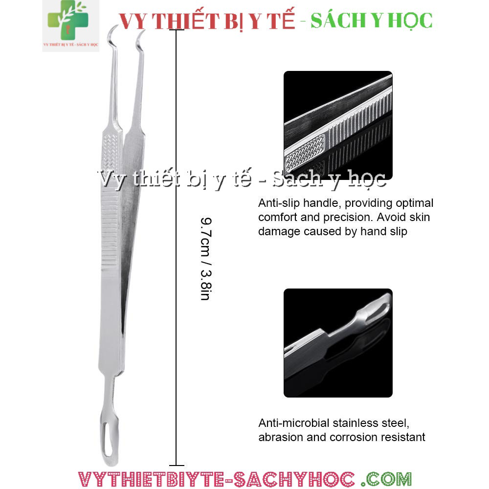 • Hướng dẫn sử dụng: Rửa sạch mặt, dùng đầu cong của nhíp ấn vào xung quanh nhân mụn để mụn chồi lên, sau đó dùng đầu nhọn gắp mụn ra khỏi bề mặt da - Rửa sạch lại mặt bằng nước muối sinh lý hoặc nước muối tự nấu và qua lọc
