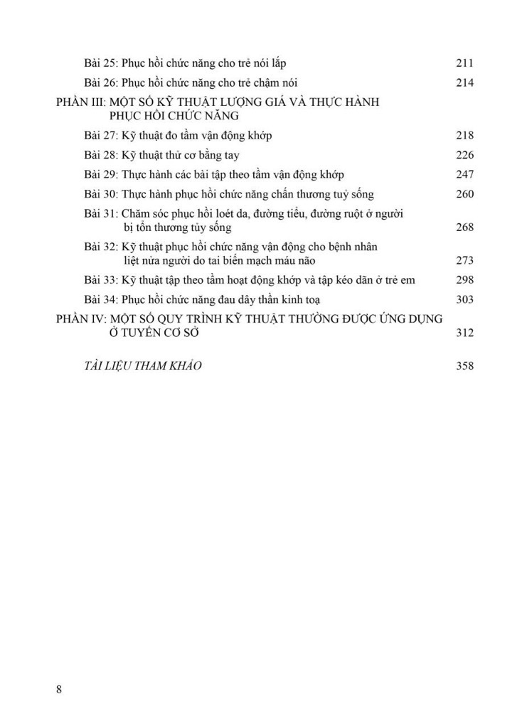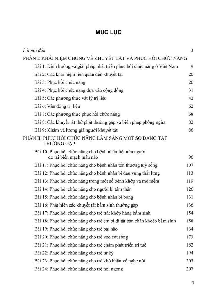 - Phần 1: Khái niệm chung về khuyết tật và phục hồi chức năng. - Phần 2: Phục hồi chức năng cho một số dạng tật thường gặp. - Phần 3: Một số kỹ thuật lượng giá và thực hành phục hổi chức năng. - Phần 4: Một số quy trình kỹ thuật phục hồi chức năng áp dụng ở tuyên cơ sở.