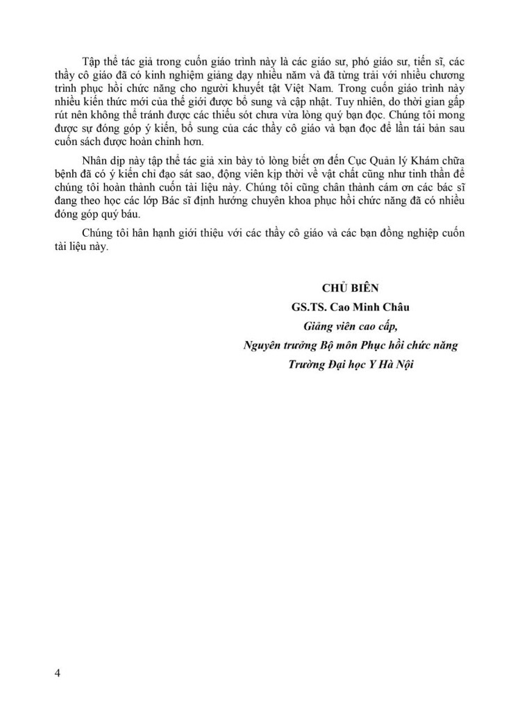 Cuôn giáo trình này dùng cho các thây cô giáo đế chuân bị các khoá đào tạo bác sĩ định hướng chuyên khoa và cho các bác sĩ mới chuyển qua làm việc với chuyên ngành Phục hôi chức năng tham khảo. Do thời gian và chương trình đào tạo BSÐHCK PHCN ở mỗi trường đại học Y có khác nhau nên chúng tôi đề xuất những phần cơ bàn nhât, đảm bảo 70% khối lượng của chương trình, 30% còn lại để các thấy cô giáo linh động bổ sung cho phù hợp với chương trình, nội dung, thời gian đào tạo và hoàn cảnh của trường mình.