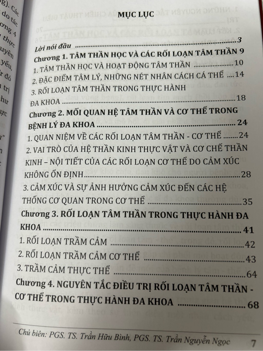 Cuốn sách gồm 4 chương gồm : Tâm thần học và các rối loạn tâm thần, Mối quan hệ tâm thần và cơ thể trong bệnh lý đa khoa, Rối loạn tâm thần trong thực hành đa khoa, Nguyên tắc điều trị rối loạn tâm thần cơ thể trong thực hành đa khoa.
