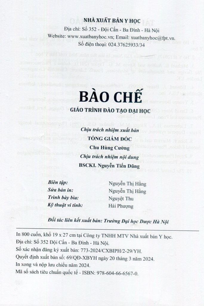 "Bào chế " là cuốn sách nói về bào chê các dạng thuốc phương Đông, là phần tiếp nối của chế biến đê chuyên từ thuôc chín thành các dạng thuôc sử dụng trực tiếp cho người bệnh, đó là các dạng Cao, Đơn, Hoàn, Tán, Đĩnh, Lộ ... và Thuôc sắc.