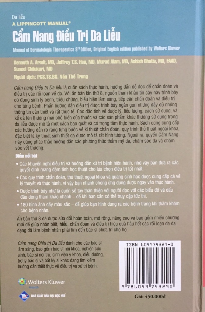 CẨM NANG ĐIỀU TRỊ DA LIỄU Ấn phẩm được chào đón nhiệt tình và chúng được sử dụng rộng rãi ở Hoa Kỳ và khắp thế giới qua các phiên bản tiếng Tây Ban Nha, Bồ Đào Nha, Ý, Indonesia, Pháp và Trung Quốc. Cẩm nang Điều trị Da liễu là cuốn sách thực hành, hướng dẫn dễ đọc để chẩn đoán và điều trị các rối loạn về da.