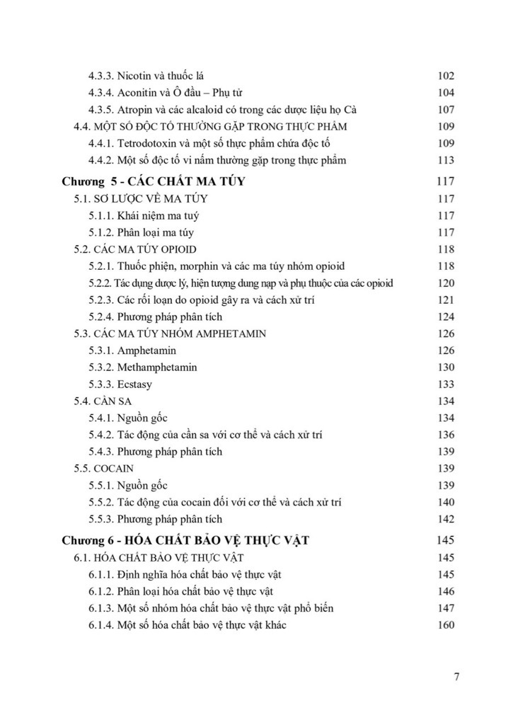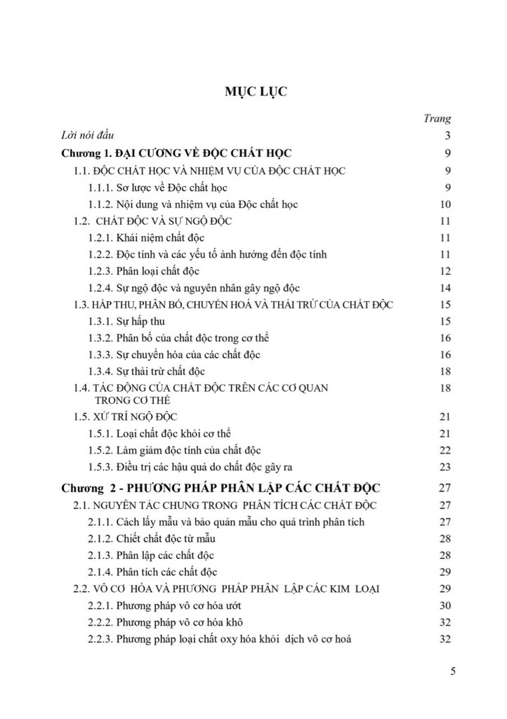 Nội dung chính của tài liệu này được bắt đầu từ Chương 1 giới thiệu sơ lược về môn học, khái niệm chất độc, sự hấp thu, phân bố, chuyển hóa, thải trừ, các tác động của chất độc đối với cơ thể và nguyên tắc xử trí ngộ độc. Phân loại chất độc cho thấy chất độc rất đa dạng có thể là các hợp chất vô cơ (chủ yếu là các kim loại và nguyên tố có độc tính), đặc biệt nhiều hợp chất hữu cơ mà trong đó có các dược chất là các chất độc. Các chất độc có nguồn gốc, mức độ sử dụng, nguyên nhân gây độc, phương pháp phân tích và cách xử trí ngộ độc khác nhau.