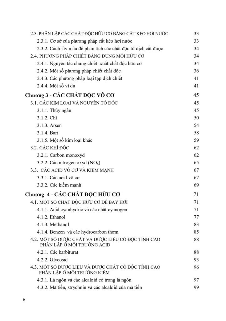 Với mỗi chất độc, tài liệu tóm lược nguồn gốc, một số tính chất lý hóa, nguyên nhân xẩy ra nhiễm độc, ngộ độc, các tác động của chất độc đối với các cơ quan trên cơ thể, các biểu hiện khi bị ngộ độc, nhiễm độc, phương pháp phân tích và cách xử trí khi bị ngộ độc, nhiễm độc hoặc nghiện. Các nội dung này của một số chất độc vô cơ thường gặp gồm các kim loại nặng, nguyên tố có độc tính cao và các khí độc được giới thiệu một cách tóm lược ở Chương 3. Các chất độc hữu cơ thường gặp được lần lượt giới thiệu trong Chương 4. Một số chất độc hữu cơ có mục đích sử dụng và tác động với cơ thể khá chuyên biệt là các ma túy và các hóa chất bảo vệ thực vật được giới thiệu riêng ở Chương 5 và Chương 6