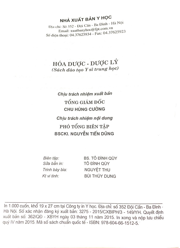 Cuốn sách đã được biên soạn dựa trên chương trình giáo dục Trung học chuyên nghiệp do Bộ Y tế ban hành. Năm 2005, sách đã được Hội đồng chuyên môn của Bộ Y tế thẩm định, được Bộ Y tế thống nhất sử dụng làm tài liệu dạy - học chính thức cho đối tượng Dược sỹ trung học của ngành trong giai đoạn hiện nay. Trong thời gian từ 3 đến 5 năm, sách cần được chỉnh lý, bổ sung và cập nhật.