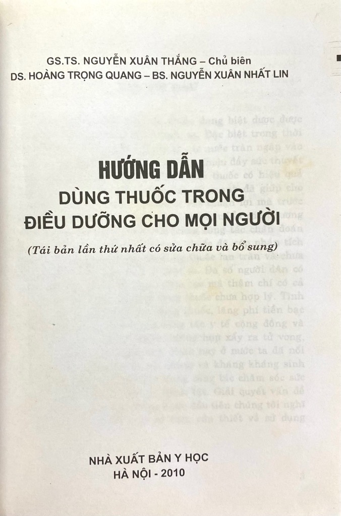 Cuốn sách: “Hướng dẫn dùng thuốc trong điều dưỡng cho mọi người” nhằm giới thiệu những nguyên tắc cơ bản, những tác dụng không mong muốn cần tránh, những biện pháp chăm lo sức khoẻ khi dùng thuốc. Hy vọng cuốn sách sẽ mang lại ích lợi cho người sử dụng thuốc an toàn, hợp lý.
