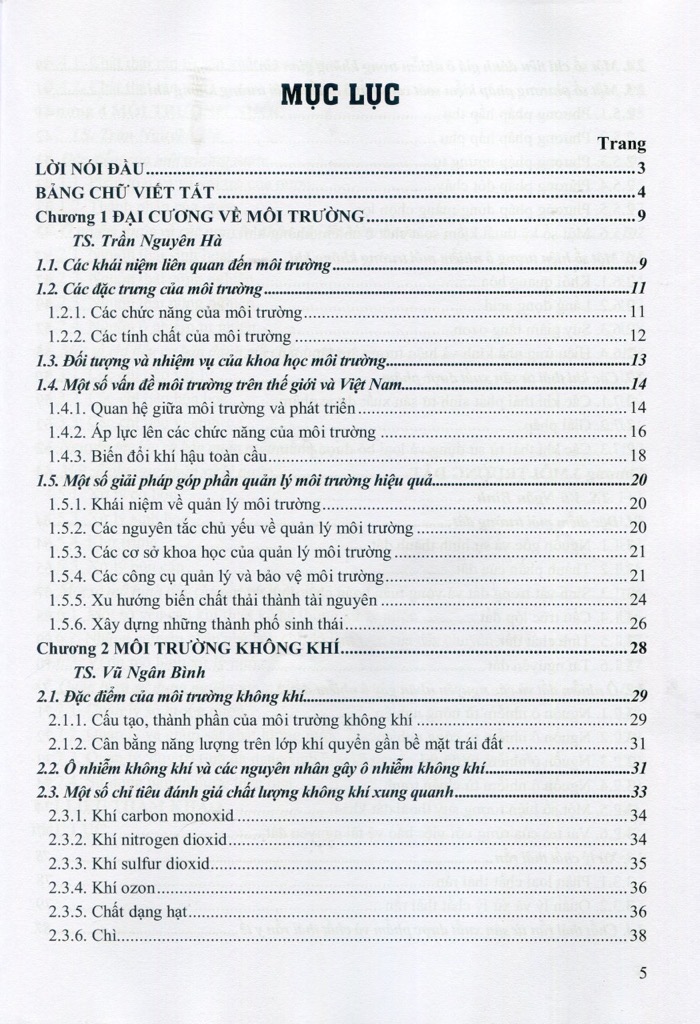 Tài liệu chia làm 4 chương: chương đầu đại cương về môi trường và 3 chương sau về môi trường không khí, đất, nước. Trong mỗi chương, các tác giả trình bày tính chất hoá học, các nguyên nhân gây ô nhiễm môi trường và các giải pháp kiểm soát xử lý ô nhiễm