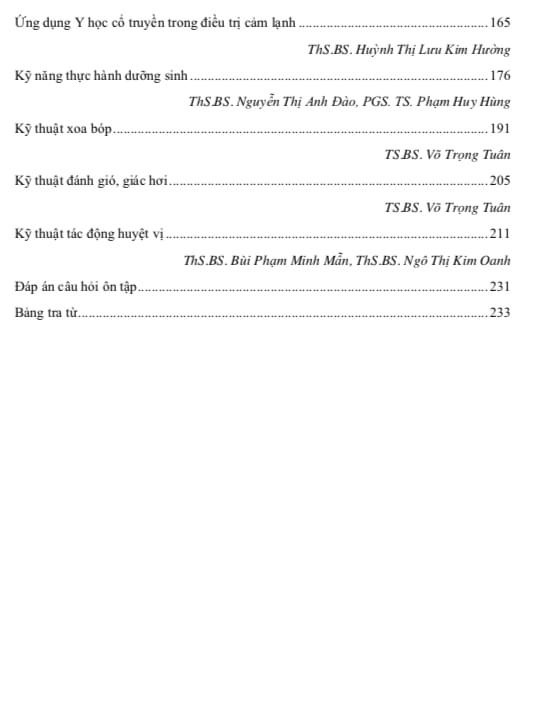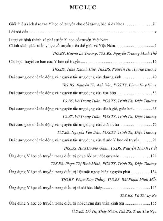 Các bài đại cương: đại cương cơ chế tác động và nguyên tắc ứng dụng của các phương pháp điều trị trong YHCT bao gồm dưỡng sinh, xoa bóp, đánh gió, giác hơi, châm cứu và thuốc Y học cổ truyền: Trong từng phương pháp người đọc sẽ được giới thiệu lịch sử, xuất xứ của phương pháp, giải thích cơ chế tác động theo Tây y và Đông y, nguyên tắc kỹ thuật và cách ứng dụng phương pháp đó trong điều trị.